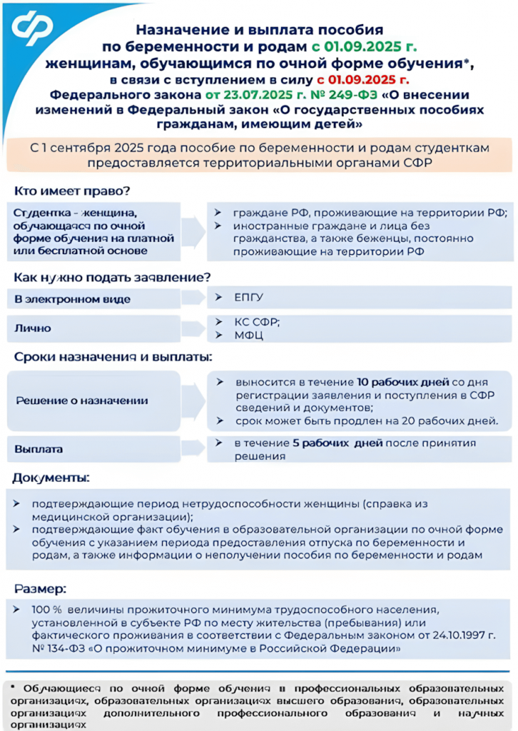Назначение и выплата пособия по беременности и родам для женщин, обучающимся по очной формы обучения